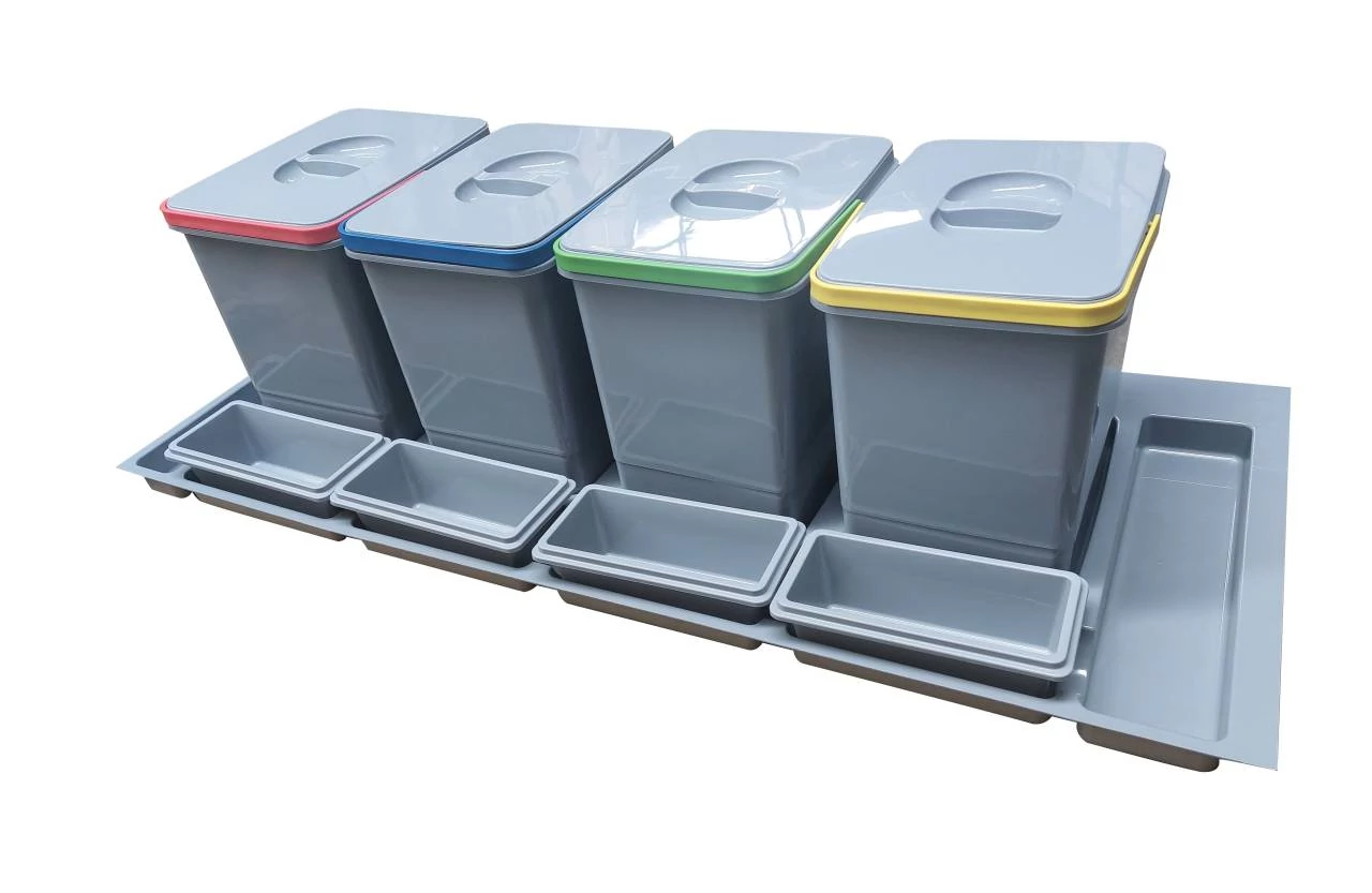szelektív hulladékgyűjtési lehetőség, rugalmasan összeállítható kombinációk, optimalizált helykihasználás, könnyen kivehető akár mosogatógépben is mosható fedeles szemetes vödrök és tálcák, színes ergonomikus fogantyúk, egyszerű és gyors telepítés, BLUM – HETTICH – GRASS fiókhoz kompatibilis