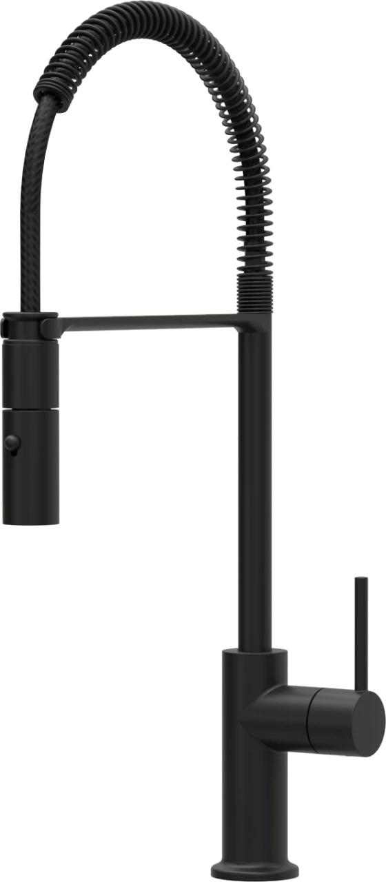 Egykaros félprofesszionális, ívelt, magas, kerámiabetétes csaptelep, oldalsó szabályzóval, forgatható kifolyócsővel, flexibilis zuhanyfejjel, normál beépítéssel, Ø35 mm-es furattal. 3-féle színben rendelhető.